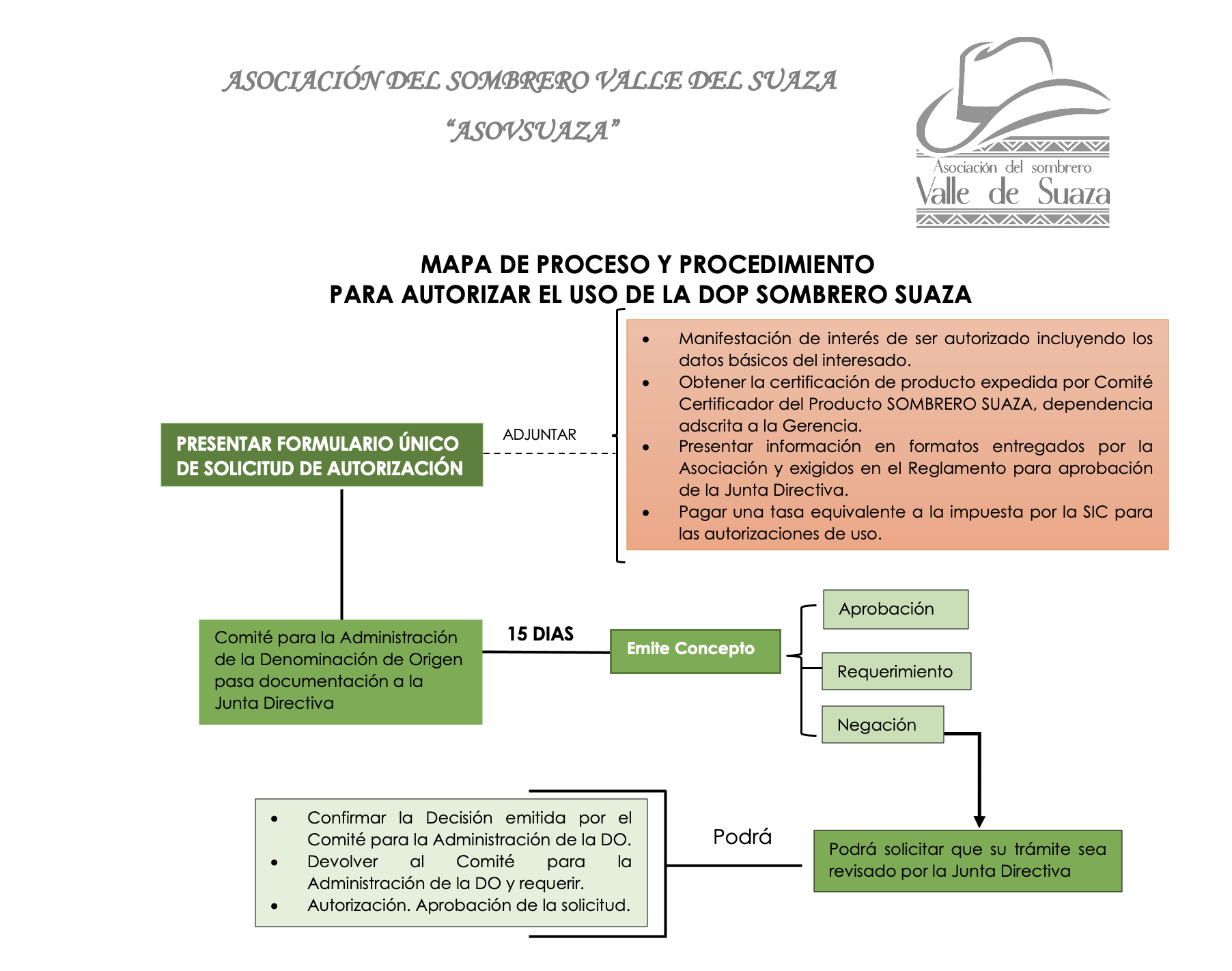 Como se desprende de los estatutos de la ASOCIACION DEL SOMBRERO VALLE DE SUAZA – ASOVSUAZA, se crea para administrar y reglamentar el uso de la DOP SOMBRERO DE SUAZA, hacia la innovación del producto y sus procesos con alto desempeño. con orientación tecnológica y de exportación del SOMBRERO DE SUAZA con DOP de nuestros asociados, que permita el desarrollo integral de sus familias, sustentadas por la generación de empleo con calidad para el mejoramiento de las condiciones de vida del producto, su familia y la comunidad.
